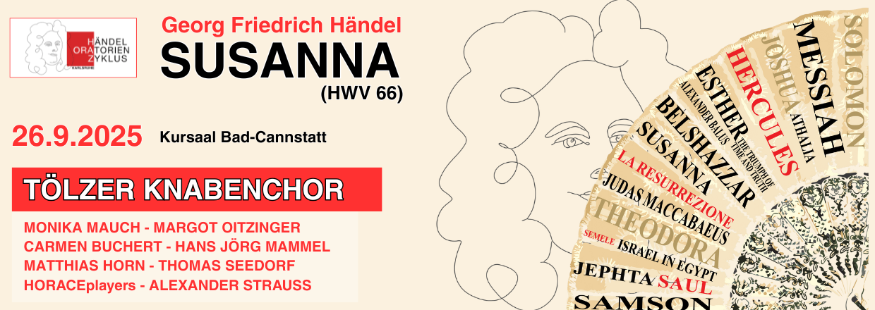 Am 20. September 2025 verwandelt sich das Theater im Kurhaus Freudenstadt in einen Schauplatz barocker Klangpracht: Im Rahmen des Händel-Oratorien-Zyklus, Karlsuhe (HORAZ) erklingt Georg Friedrich Händels bewegendes Oratorium „Susanna“ – konzertant dargeboten und in historischer Aufführungspraxis und mit einer hochkarätigen Besetzung.